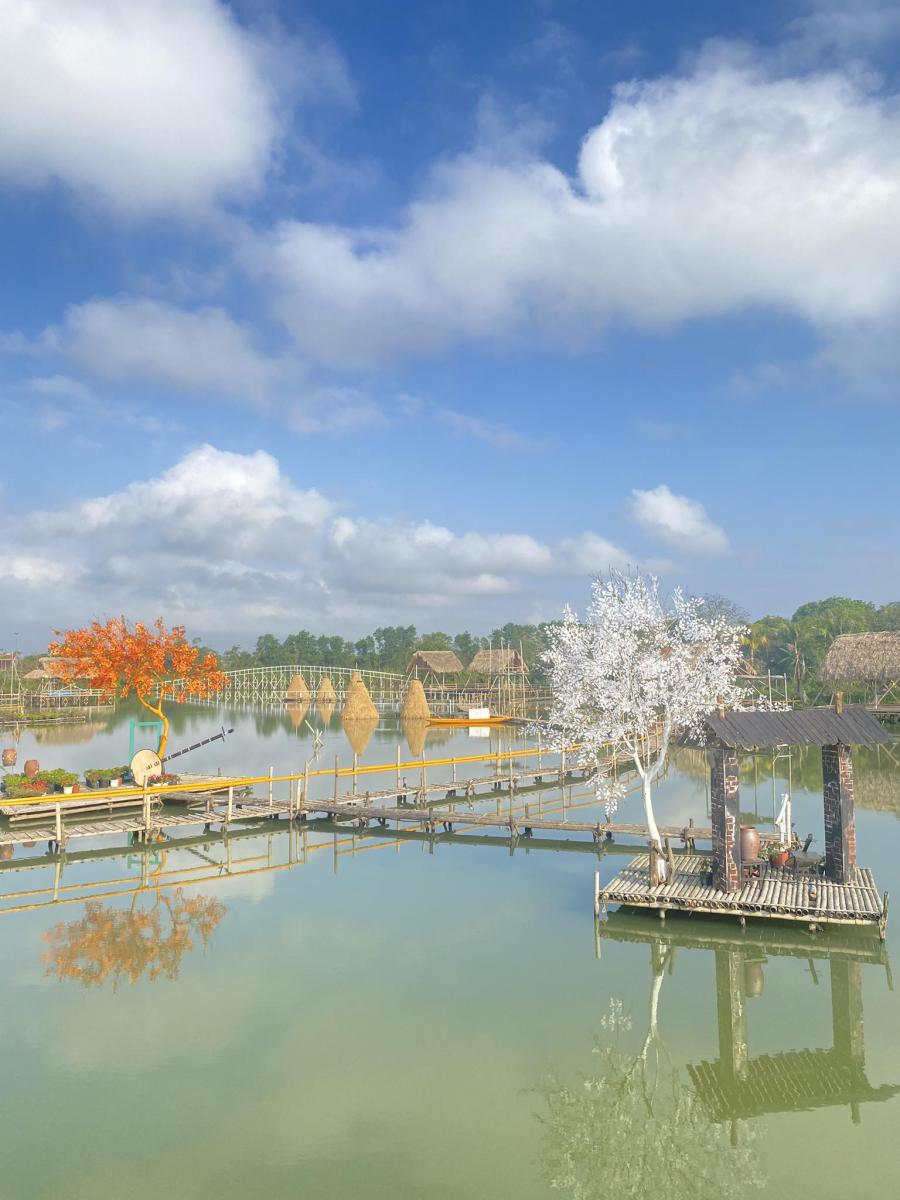 Từ cổng vào, khu vườn, hồ nước đến các dãy nhà gỗ đều rất “ăn ảnh”. Đây là địa điểm lý tưởng cho những bộ ảnh du xuân mang phong cách nghỉ dưỡng cao cấp và thanh lịch.
