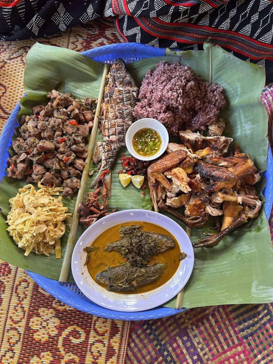 Sống cùng người Bru – Vân Kiều là phần hấp dẫn không thể thiếu của chuyến đi. Nhà sàn ấm áp, bếp lửa hồng, tiếng cười nói, lời kể của các già làng và điệu múa truyền thống là những mảnh ghép tạo nên bức tranh đời sống chân phương. Du khách được mời ngồi cùng mâm, thưởng thức những món ăn đặc trưng như cá suối nướng - cá được bắt tại địa phương, tẩm ướp đơn giản rồi nướng trực tiếp trên than hồng, giữ nguyên vị ngọt tự nhiên; canh đoác — món canh nấu từ rau rừng, thơm và đậm đà; bên cạnh đó là chén rượu men nồng, ấm áp, gắn liền với văn hóa giao tiếp trong các dịp sum họp.