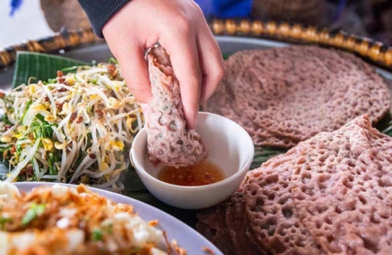 Khác với bánh xèo những nơi ở Huế hay Quảng Nam giòn rụm, bánh xèo Quảng Hòa được chế biến từ bột gạo lứt mang hương vị béo ngậy, được ăn kèm cùng cá chuối, giá đỗ, nộm đu đủ chấm nước mắm tỏi ớt chua ngọt. Hương vị thơm ngon gắn liền với tuổi thơ tạo nên hương vị khó quên.